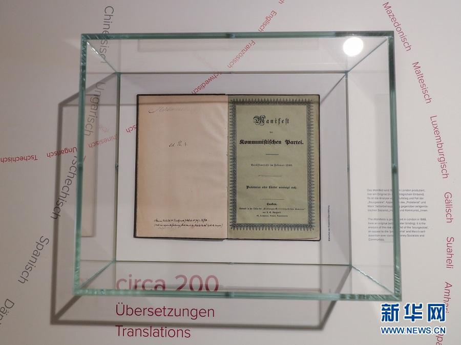 历史长河奔流不息,真理之光穿越时空。1818年5月5日,德国小城特里尔,一代伟人马克思诞生。200年后,世界东方。高擎马克思主义的精神火炬,在习近平新时代中国特色社会主义思想指引下,中国共产党正领导亿万人民书写人类发展史上新的奇迹。这是2018年5月3日在德国特里尔马克思故居纪念馆内拍摄的1848年出版的《共产党宣言》第一版。