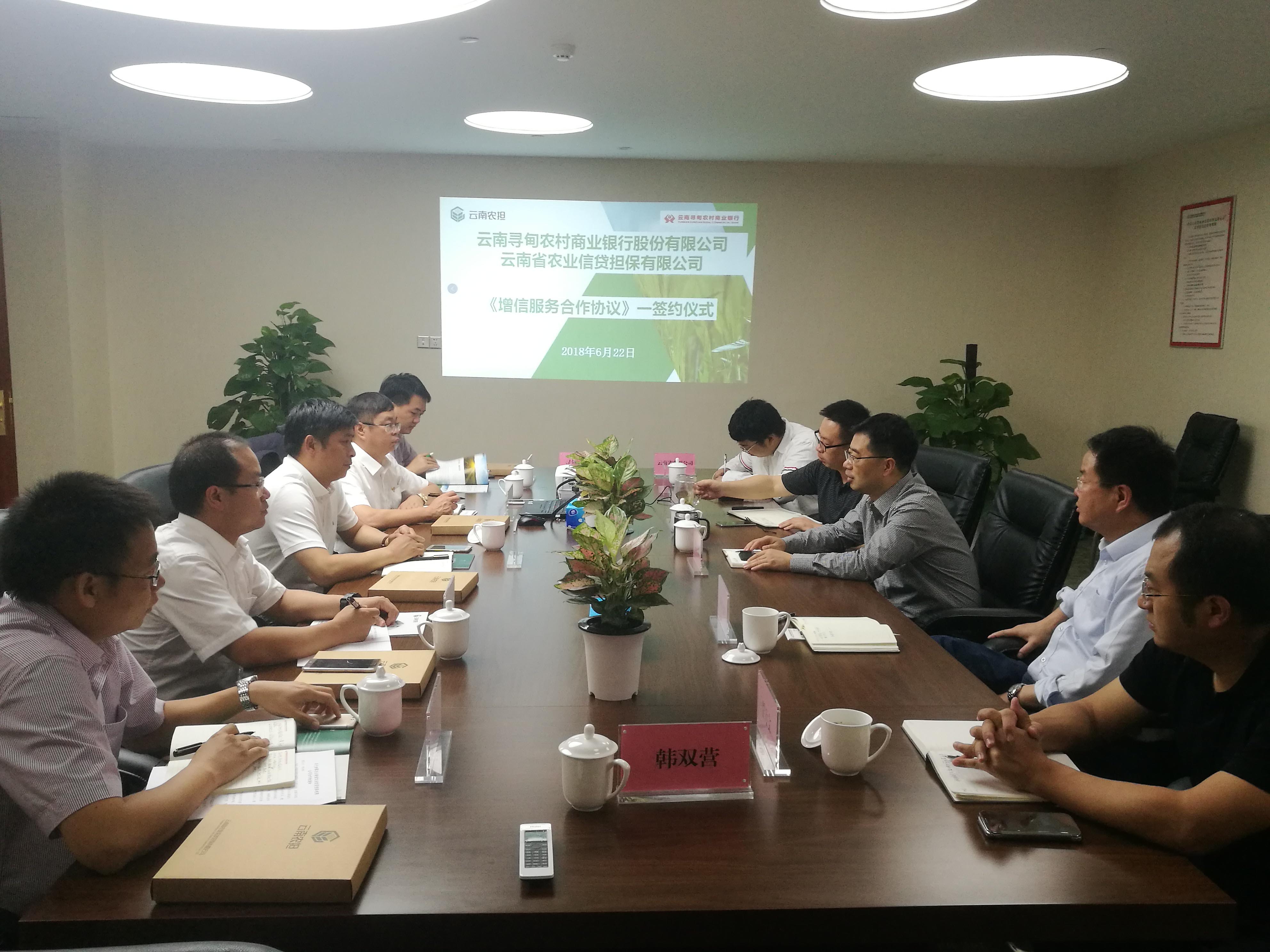2018年6月22日,云南省农业信贷担保有限公司与云南寻甸农村商业银行股份有限公司在昆明召开银担合作座谈会,并签署《寻甸县新型农业经营主体增信服务合作协议》。省农业信贷担保有限公司董事长郭影、总经理杜开波、副总经理廖寅皓,寻甸农商行董事长虞燕林、行长李叶忠、副行长范彪等领导参加座谈。