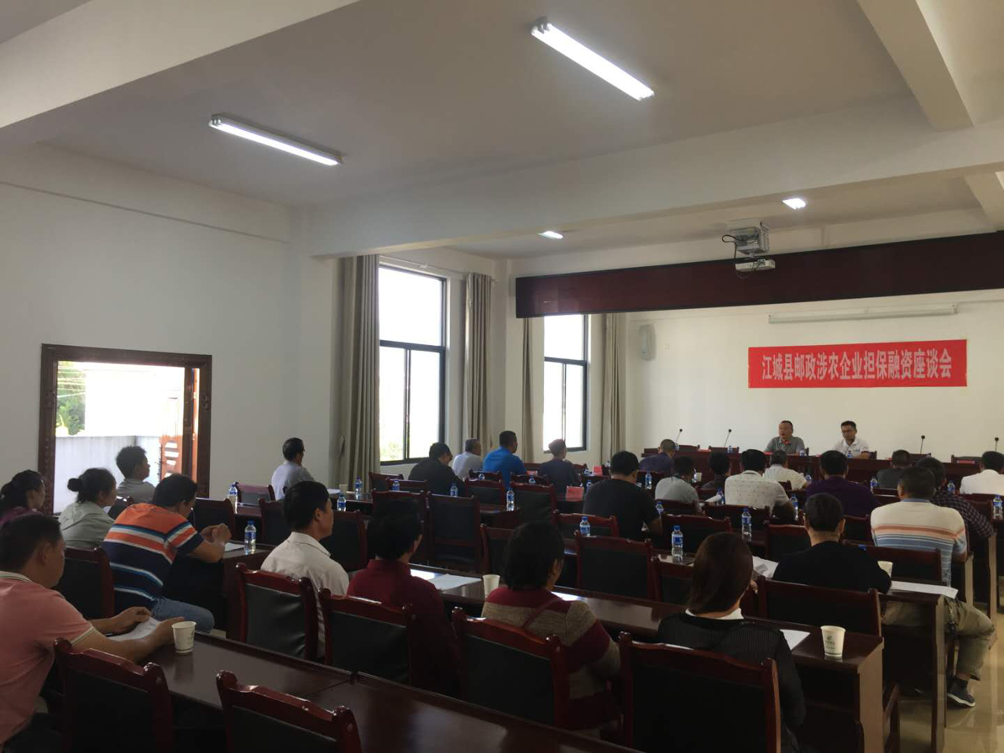 2018年9月21日,为响应8月中旬整董会议精神,经1个月多方筹备后,公司普洱办事处戴维应邀到江城县参加邮储银行举办的“银企座谈会”,与江城县邮储负责人普及进行业务政策宣讲,江城县上百家涉农企业参加座谈。会上,普洱办事处戴维就公司成立背景、政策方向、服务范围、当前业务开展进度和业务流程等进行讲解,现场与客户联动,针对公司准入具体标准、资料准备要素、房产、林权等反担保物标准等具体问题进行解释说明,现场达成意向贷款户89户,意向金额3700万元,计划国庆收假后普洱办事处与银行联合尽调项目,争取10月底将项目落地。