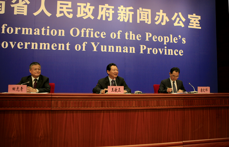 云南省人民政府新闻办公室专职副主任田虎青主持发布会,云南省打造世界一流“绿色食品牌”工作领导小组办公室主任、省委农办主任、省农业厅厅长王敏正,云南省工业和信息化委员会副书记、副主任唐文祥分别发布新闻。