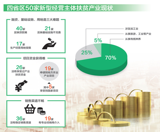 据调查,受访的50家新型经营主体中,80%的主体反映“差钱”。资金难是扶贫产业发展的主要瓶颈。