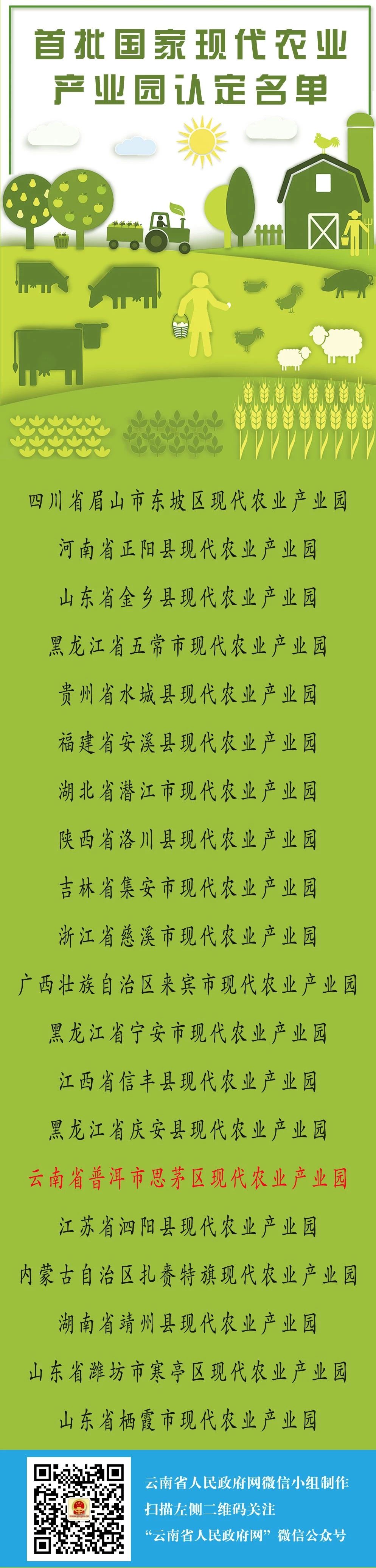 在2018年12月30日召开的全国农业农村厅局长会议上,农业农村部、财政部公布:经自评申请、省级推荐、绩效评价和现场考察等程序,四川省眉山市东坡区等20个现代农业产业园被认定为首批国家现代农业产业园,其中云南省普洱市思茅区现代农业产业园入选。