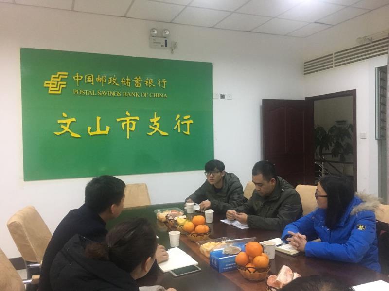 2019年1月8日,文山办事处全体员工受邀到中国邮政储蓄银行文山市支行进行座谈,中国邮政储蓄银行文山州分行三农金融部总经理、文山市支行行长李洪,文山市支行信贷部主任李顺成以及信贷客户经理参加座谈。
