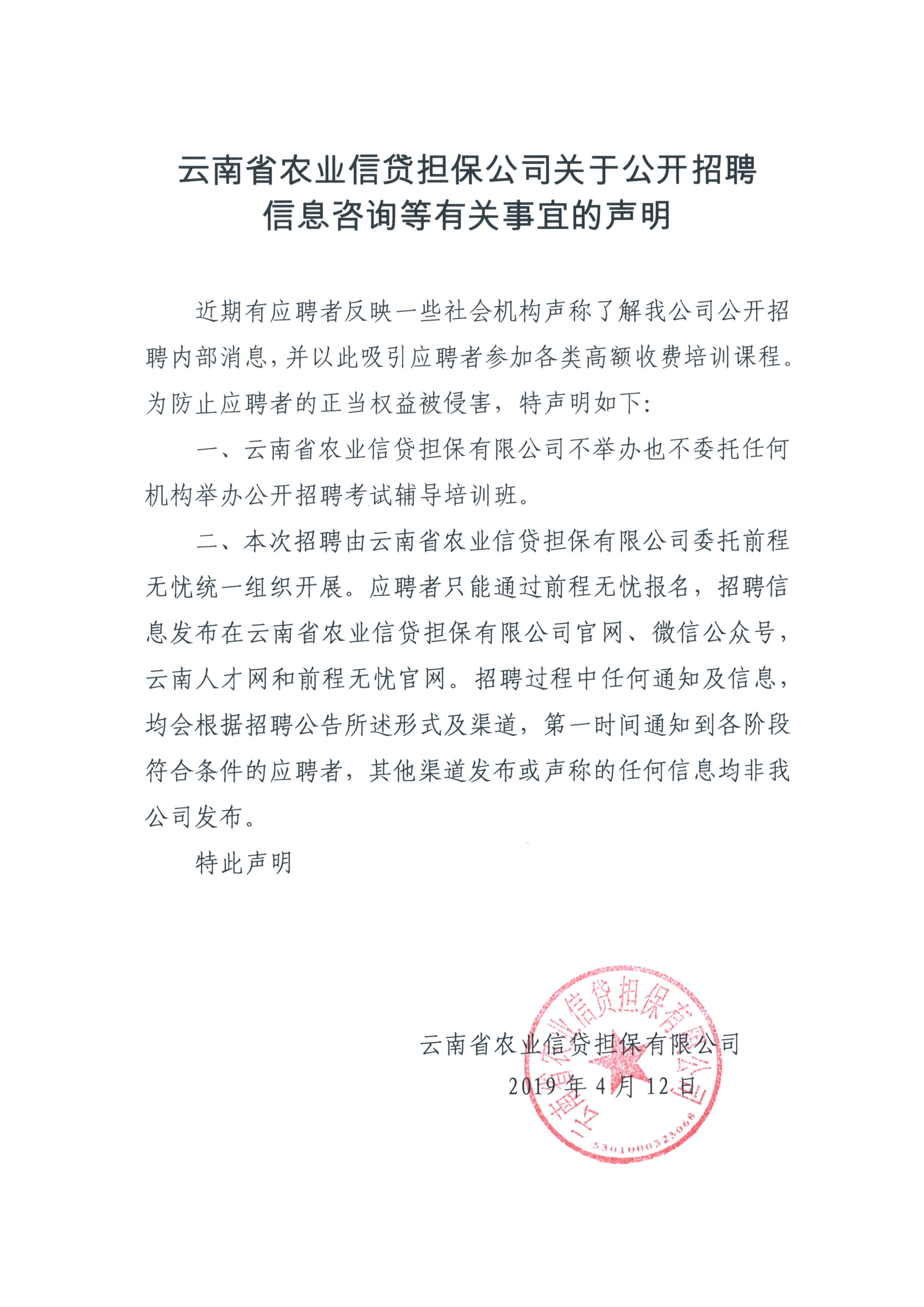云南省农业信贷担保有限公司关于公开招聘信息咨询等有关事宜的声明