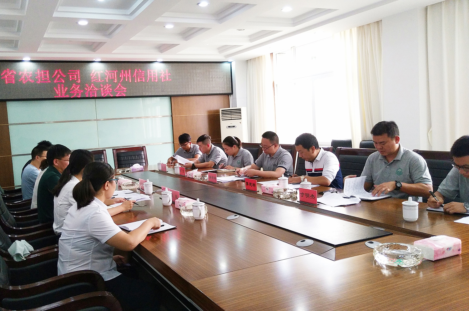 在与省联社红河办事处以及其他各合作银行的座谈会中,公司副总经理廖寅皓充分肯定了双方在前期合作中取得的成效,并逐一详细解答了省联社红河办事处以及其他个合作银行的疑虑和问题,并对农担公司的成立背景、业务“双控”标准、风险管理等作了详尽介绍,着重讲解了公司担保产品设计、风险合规以及操作优势全流程,分析了“农担”与“农信”业务长期合作的可行性和必然性,强调了农担公司高度重视与农信社系统的合作,对双方进一步深入合作寄予期望,提出希望银担双方能够坚定合作信心、合作诚意,在充分考虑风险、合规的前提下实现业务合作全面提质、增量。