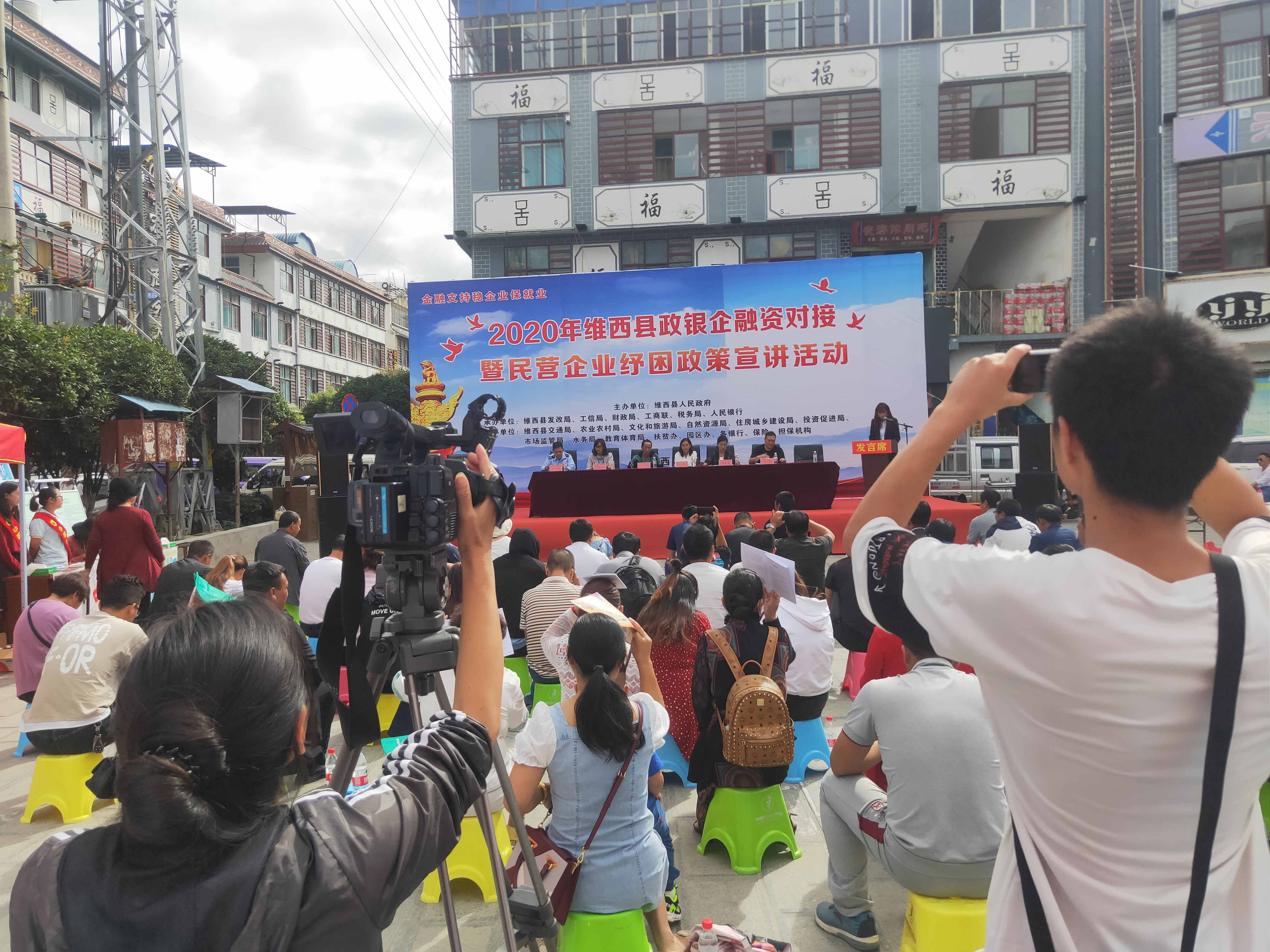 为持续加大金融服务企业复工复产力度,解决企业“融资难、融资贵”问题,推进疫情后企业快速发展,助推全县经济社会高质量发展贡献金融力量,8月29日上午,在中国人民银行维西县支行及维西县人民政府的牵头组织下,维西县2020年政银企融资对接暨民营企业纾困政策宣讲活动在维西县念萨街广场举行,县级17个相关部门大力配合筹备并参加了活动,维西县3家银行金融机构、3家保险机构、1家担保机构以及近40户小微企业(含个体工商户)参加活动,维西办事处作为受邀机构,参加了这次活动。在活动上,政府领导杨春芳同志指出本次活动的重要意义,强调全县各级各部门坚决贯彻党中央、国务院和省委省政府的决策部署,并代表县委县政府表态,维西县将继续优化营商环境,营造良好的投融资环境,提供优质的服务,全力支持中小企业发展。中国人民银行迪庆州中心支行郑云霞副行长发言,强调要进一步用好用活各项政策,政府、金融机构、企业各方发力,共同助推维西经济社会发展。在活动中,维西办事处设立展台,向参会企业、个体工商户介绍了我公司的担保政策,为下一步业务发展打下基础。