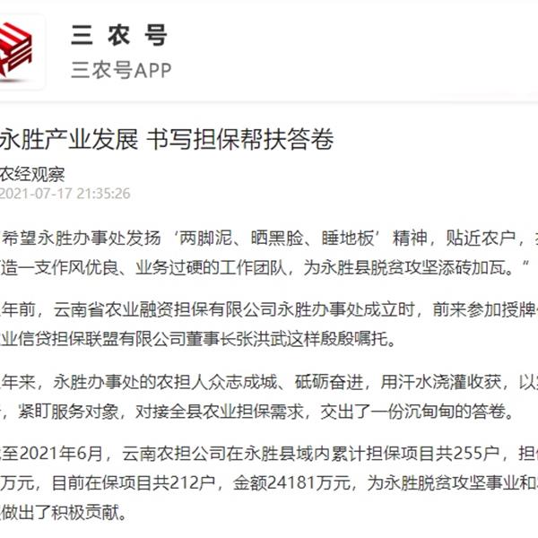 2021年7月17日,《农民日报》三农号以“助力永胜产业发展 书写担保帮扶答卷”为题对心博网页版页面登录永胜办事处进行了专题报道。