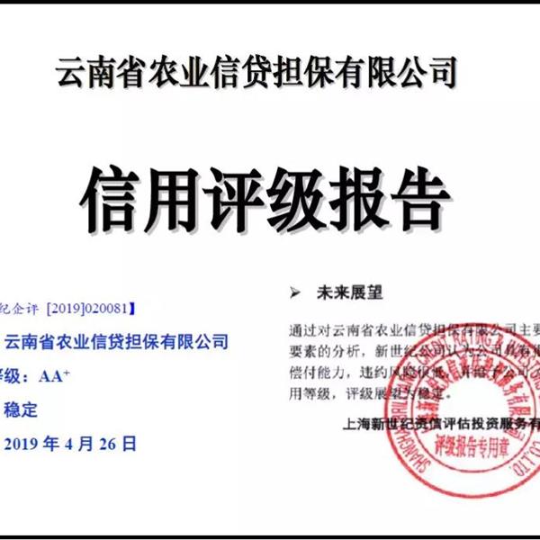 云南省农业信贷担保有限公司获得AA+企业主体信用评级